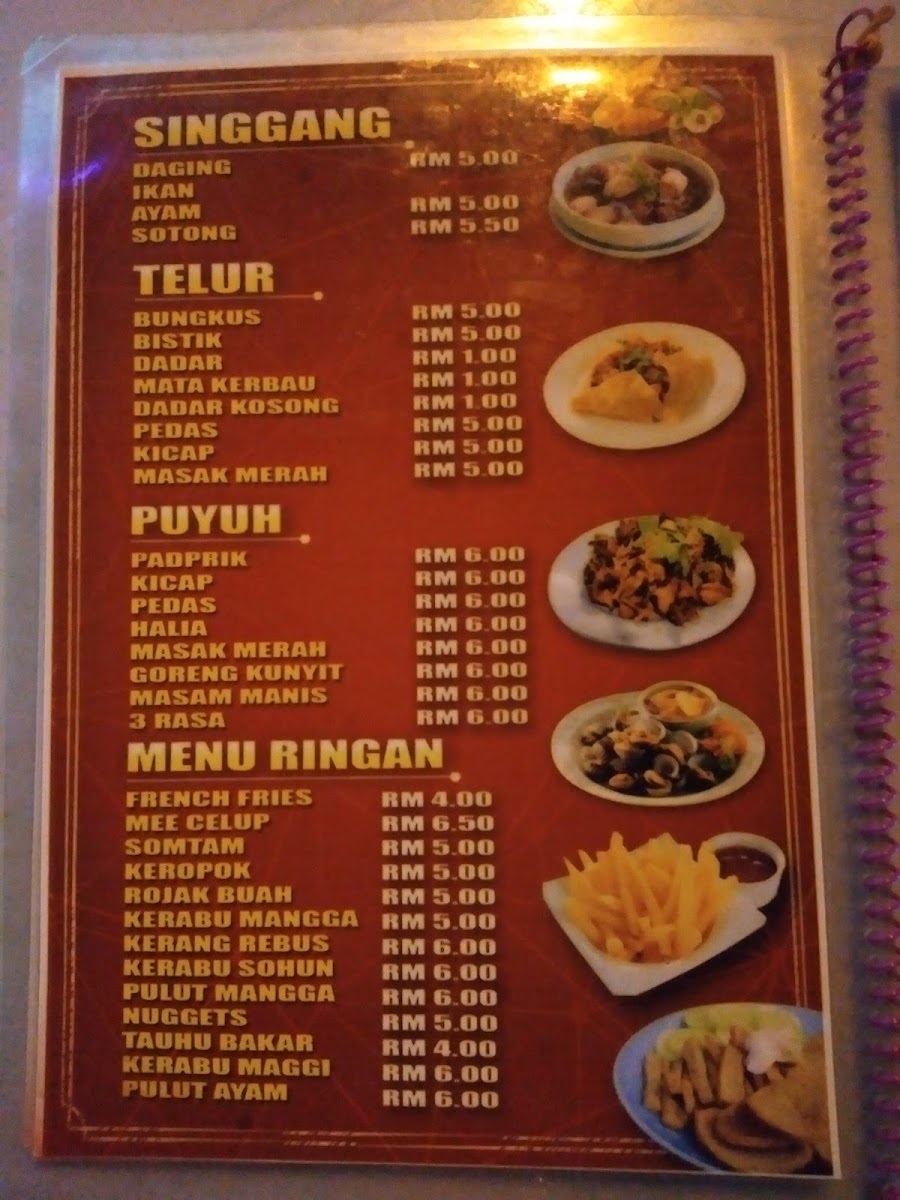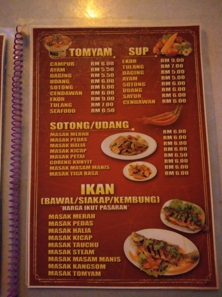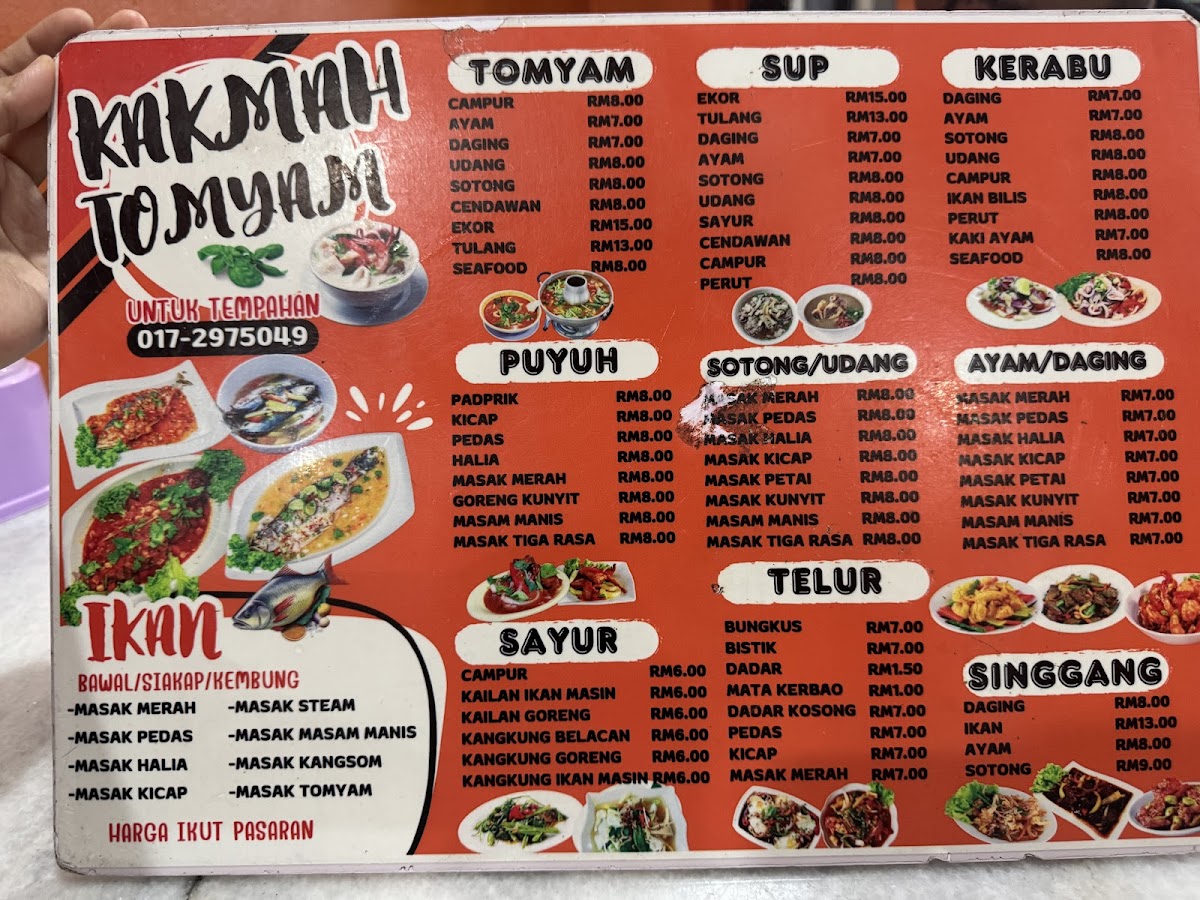 Restoran Kak Mah Seafood offers a diverse and flavorful menu with a variety of dishes to cater to different tastes. For noodle lovers, you can choose from options like Maggi Sup (RM 7.50), Maggi Bandung (RM 8.50), or a hearty Kueteow Goreng (RM 8.00). For those craving something tangy, their Singang Ikan (RM 11.00) and Singang Daging (RM 12.00) are perfect choices. If you're in the mood for meat dishes, options such as Daging Masak Masam Manis (RM 13.00), Ayam Masak Halia (RM 12.00), and Daging Black Pepper (RM 14.00) are sure to impress. Seafood lovers can indulge in their variety of Tomyam dishes like Tomyam Udang (RM 15.00) or Tomyam Daging (RM 12.00), as well as Udang Masak Petai (RM 18.00) and Sotong Masak Pedas (RM 17.00). The restaurant also offers a range of egg dishes, including the classic Telur Dadar (RM 4.00) and Telur Mata Kerbau (RM 5.00). For sides, Nasi Putih (RM 2.00) and flavorful Nasi Goreng Ikan Masin (RM 8.50) are available, while their soup options, such as Sup Ayam (RM 6.00) and Sup Cendawan (RM 7.00), are great starters. To complete your meal, refresh yourself with drinks like Teh Ais (RM 3.00) or Lemon Madu Ais (RM 4.00), or enjoy a Jus Buahan like Mangga (RM 5.00). Overall, the menu is a delightful mix of local and regional flavors that are sure to satisfy any palate.