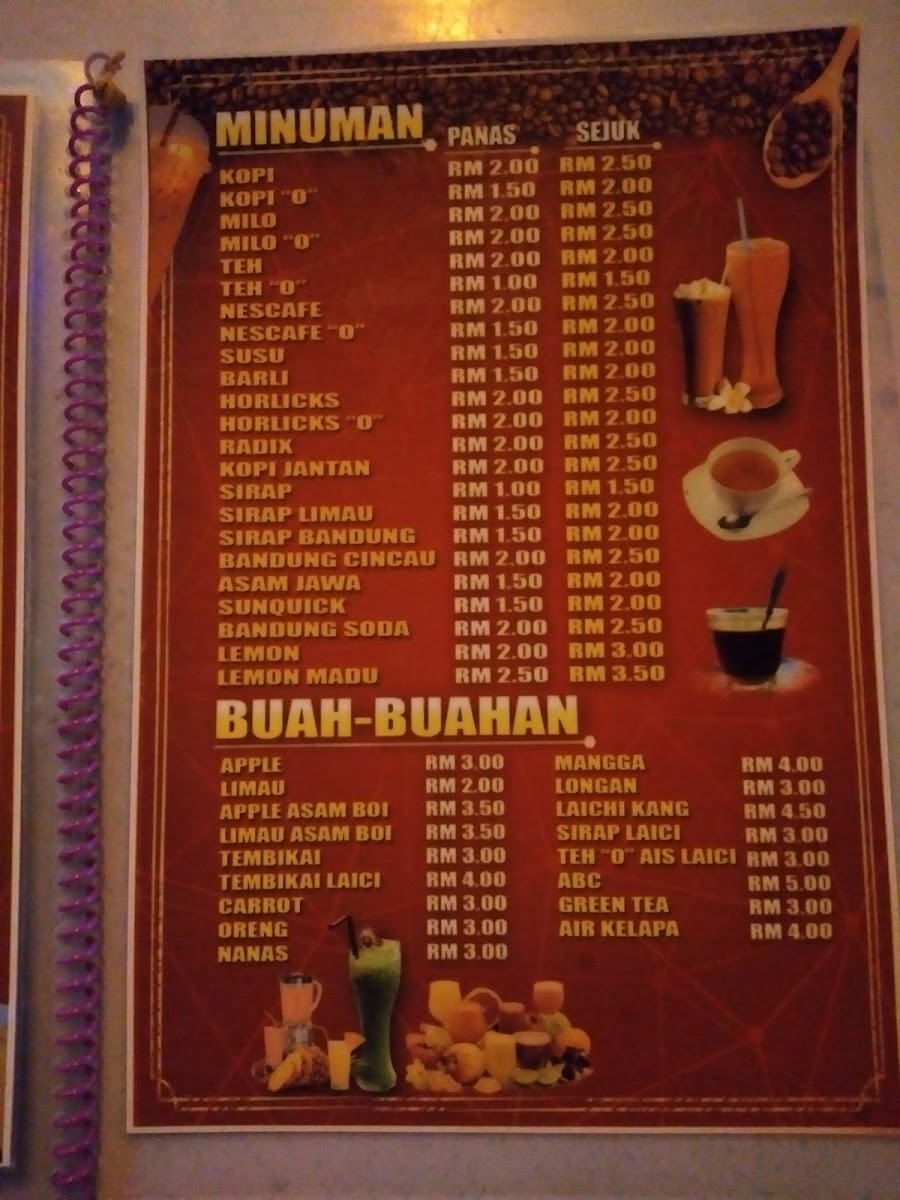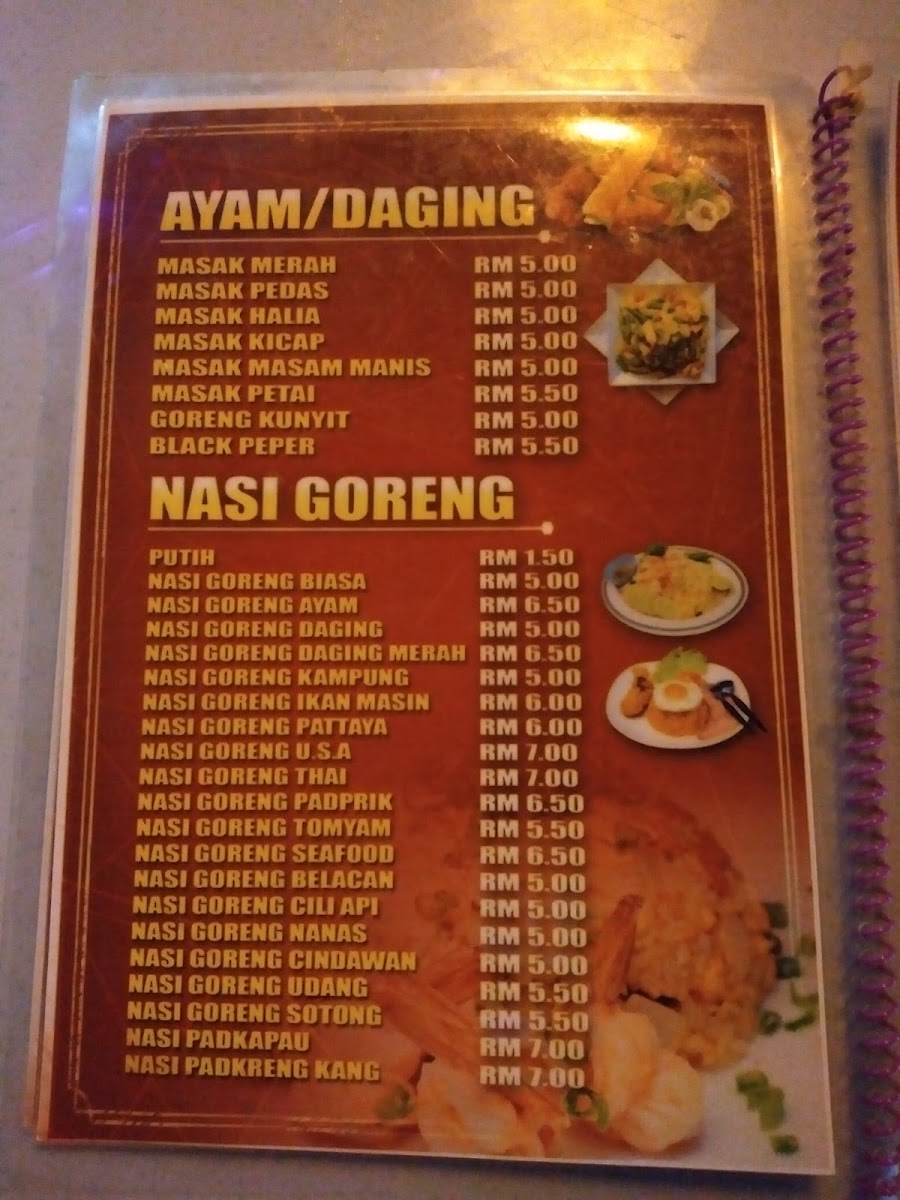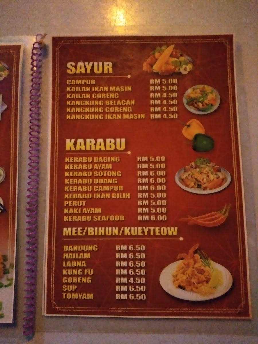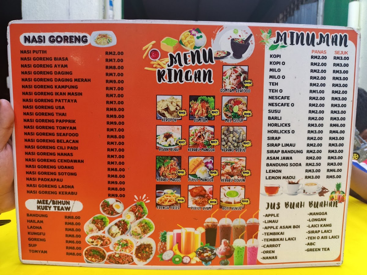Restoran Kak Mah Seafood offers a diverse and flavorful menu with a variety of dishes to cater to different tastes. For noodle lovers, you can choose from options like Maggi Sup (RM 7.50), Maggi Bandung (RM 8.50), or a hearty Kueteow Goreng (RM 8.00). For those craving something tangy, their Singang Ikan (RM 11.00) and Singang Daging (RM 12.00) are perfect choices. If you're in the mood for meat dishes, options such as Daging Masak Masam Manis (RM 13.00), Ayam Masak Halia (RM 12.00), and Daging Black Pepper (RM 14.00) are sure to impress. Seafood lovers can indulge in their variety of Tomyam dishes like Tomyam Udang (RM 15.00) or Tomyam Daging (RM 12.00), as well as Udang Masak Petai (RM 18.00) and Sotong Masak Pedas (RM 17.00). The restaurant also offers a range of egg dishes, including the classic Telur Dadar (RM 4.00) and Telur Mata Kerbau (RM 5.00). For sides, Nasi Putih (RM 2.00) and flavorful Nasi Goreng Ikan Masin (RM 8.50) are available, while their soup options, such as Sup Ayam (RM 6.00) and Sup Cendawan (RM 7.00), are great starters. To complete your meal, refresh yourself with drinks like Teh Ais (RM 3.00) or Lemon Madu Ais (RM 4.00), or enjoy a Jus Buahan like Mangga (RM 5.00). Overall, the menu is a delightful mix of local and regional flavors that are sure to satisfy any palate.
